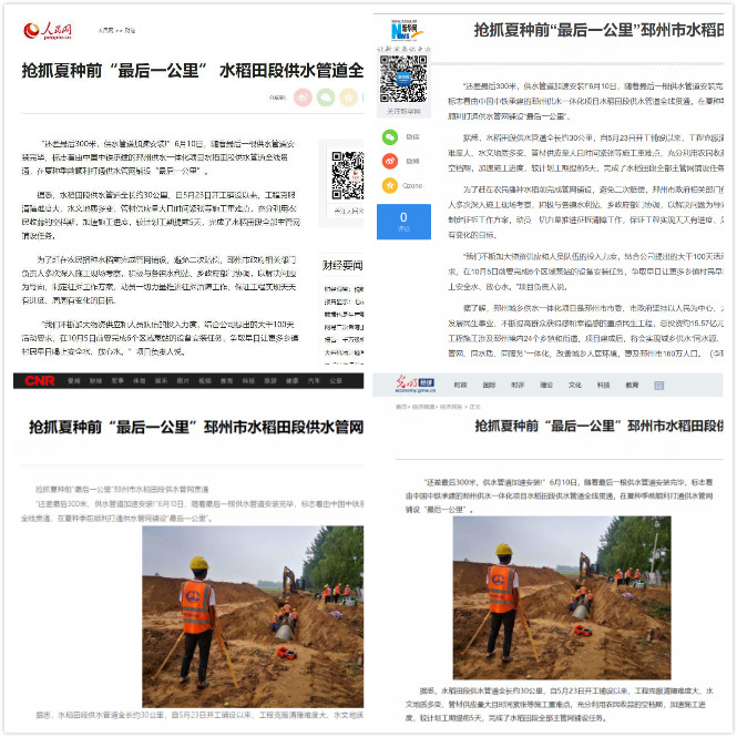 610日,由公司承建的邳州市供水一體化PPP項目水稻田段供水管道全線貫通。邳州市供水一體化PPP項目水稻田段供水管道全長約30公里,自523日開始鋪設以來,項目部克服清障難度大、水文地質多變、管材供應量大且時間緊張等施工重難點,充分利用農民收蒜的空檔期,加速施工進度,19天完成30公里主管網鋪設任務,較計劃工期提前5天。人民網、新華網、央廣網、中國新聞網、光明網、中國網、江南時報、江蘇視窗、徐州之窗等10余家中央級及省部級主流媒體對此進行了專題報道