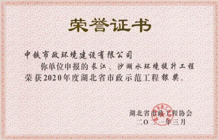 公司長江、沙湖水環境提升工程榮獲2020年度湖北省市政示范工程銀獎